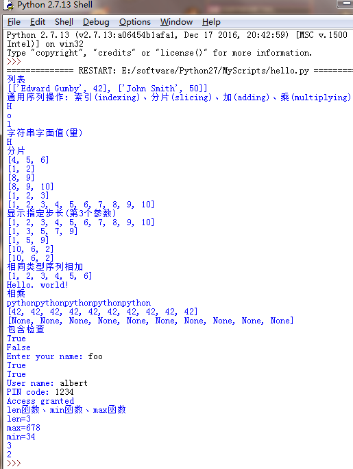 print '通用序列操作: 索引(indexing)、分片(slicing)、加(adding)、乘(multiplying)'