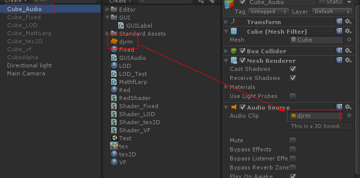 一、在场景中建一个Cube,再在上面挂上AudioSource组件,并把一个音频拖到上面