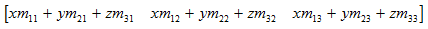 - 当用矩阵乘法实现坐标系转换时,向量左乘矩阵的形式更加方便。例如,用矩阵A,B和C转换向量v,用行向量记法记作vABC。注意矩阵按转换顺序从左往右列出。如果使用列向量,矩阵放在左边,转换从右往左发生,这种情况下应记作CBAv