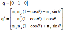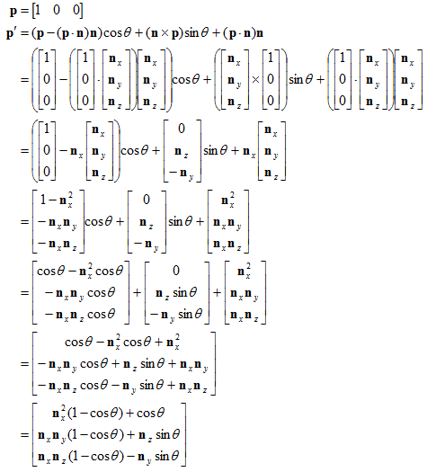 现在,已经得到v'与v,n,θ的关系公式了,可以用它来计算变换后的基向量并构造矩阵。第一个基向量为: