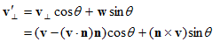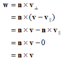 - w是同时垂直于v∥和v⊥的向量。它的长度和v⊥的相同。w和v⊥同在垂直于n的平面中。w是v⊥绕n旋转90度的结果,由n×v⊥可以得到。