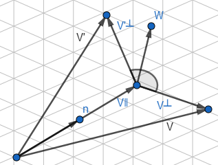 - v⊥是v垂直于n的分量。因为v=v∥+v⊥,所以v⊥=v-v∥。v⊥是v投影到垂直于n的平面上的结果。