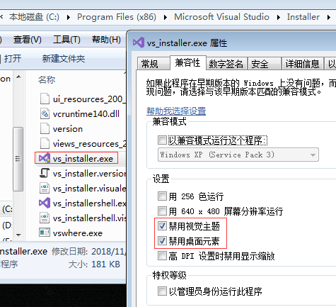 右键(vs_installer.exe)->兼容性->勾上禁用视觉主题、禁用桌面元素