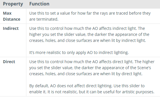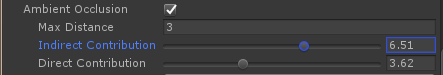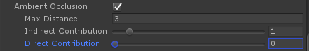 控制AO影响直接光照的程度(值越大阴影越暗),默认情况下,AO不会影响直接光照。拖动该滑动条可以开启该功能。这样并不真实,但是出于艺术目的可能很有效。