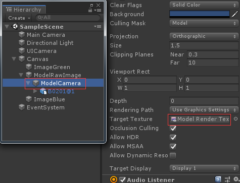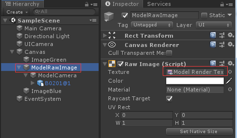 3. 创建一个用来显示模型的RawImage组件,并将Render Texture赋给它的Texture属性
