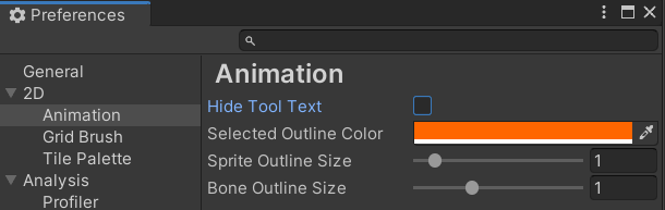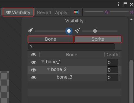 点击顶部 Visibility 按钮打开骨骼层次结构查看面板,可以查看 骨骼(bone)层次结构 和 精灵(Sprite)层次结构